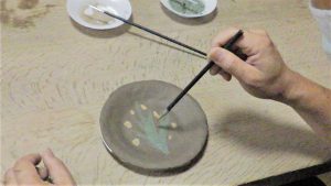 色粘土での絵付けの様子 |